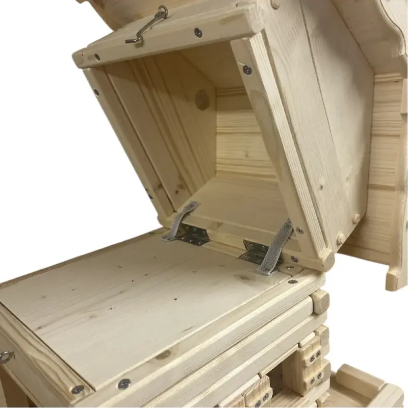 Für eine einfache und gründliche Reinigung löst man den Haken an der Seite und klappt das Dach zur anderen Seite auf. Das Dach des Nistkastens ist, während es offen steht, mit Zwei Scharnieren und Zwei Bändern gesichert. Unter dem Einflugloch ist das Holz eingekerbt, damit die kleinen Vogelbabys das Nest verlassen können. Die Futterstelle im Inneren des Vogelhauses bietet genug Platz (20,5 x 20,5 cm) für Vogelfutter und schützt es vor Nässe.