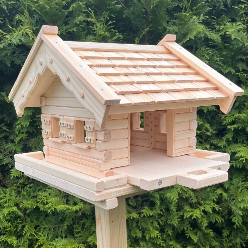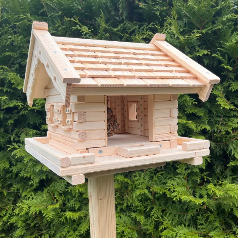 Ein charmantes Detail: Das Vogelfutterhaus Glöckchen wird standardmäßig mit kleinen, handgefertigten Fensterläden geliefert. Diese verleihen dem Haus einen verspielten, fast märchenhaften Charakter und machen es zu einem echten Hingucker im Garten oder auf der Terrasse. In Kombination mit dem kompakten Design und dem wetterfesten Dach passt es harmonisch in jede natürliche Umgebung.