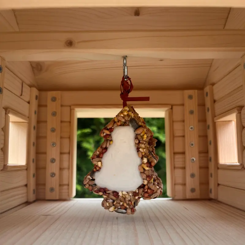 Im Inneren des Hauses befindet sich ein stabiler Holzbalken mit Haken, an dem ein Meisenknödel befestigt werden kann. So bleibt das Futter selbst bei Regen trocken und sauber, da es vor Feuchtigkeit und Schimmelbildung geschützt ist. Die Vögel können direkt auf der großzügigen Bodenplatte sitzen und bequem fressen – ganz ohne sich von außen anhängen zu müssen. Das ist besonders sicher für Meisen, Spatzen und Finken, da ihre Krallen nicht an Drahtnetzen hängen bleiben können.